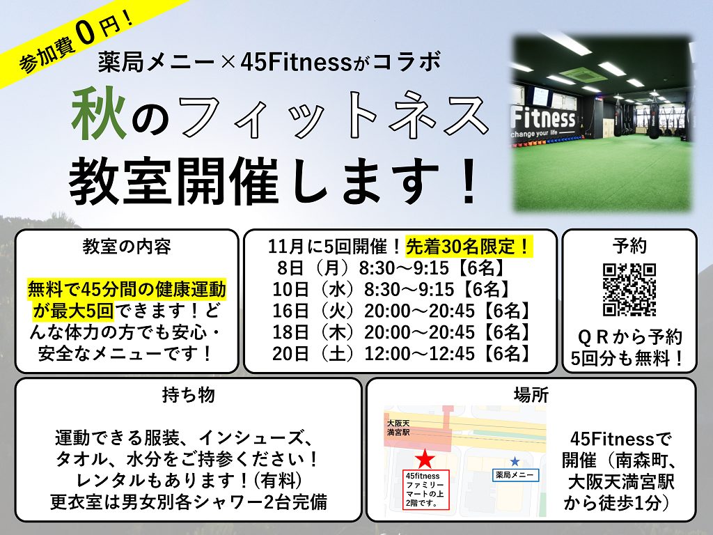 薬局メニーから近隣の45フィットネス南森町店様にご協力頂き、45分間のフィットネス教室を開催します!!